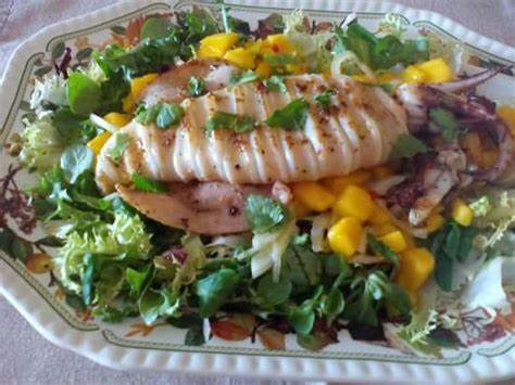 INGREDIENTES Para 4 personas • Calamar 1 • Limón zumo y ralladura 1 • Diente de ajo 2 • Pimientas variadas molidas 1/2 cucharadita • Mango grande 1 • Cebolla tierna 1 • Guindilla roja fresca • Mezclum (mezcla de lechugas) 1 bol • Cilantro fresco unas hojas • Aceite de oliva virgen extra • Sal Cómo hacer ensalada de mango y calamar a la plancha Dificultad: Fácil • Tiempo total 25 m • Elaboración 20 m • Cocción 5 m ELABORACIÓN 1- Limpiamos bien el calamar y cortamos el cuerpo en anillas dejándolas unidas por una parte. Lo ponemos en un bol con la ralladura de limón, los ajos machacados, la pimienta y dos cucharadas de aceite y dejamos marinar al menos durante treinta minutos. 2- Cortamos el mango en trozos y la cebolla en láminas finas y mezclamos ambas cosas con la guindilla cortada en rodajas y sin las semillas, el zumo de limón y una pizca de sal, removemos y dejamos marinar durante unos 10 minutos. 3- Ponemos en una fuente la mezcla de ensalada y repartimos por encima la mezcla de mango y cebolla. Calentamos una plancha y asamos el calamar el tiempo justo para que la carne se ponga blanca, le damos la vuelta para que se cocine por todos lados. Lo sacamos y lo ponemos sobre la ensalada, ponemos unas hojas de cilantro , salamos y acompañamos con un chorrito de aceite. y a disfrutar!!!!