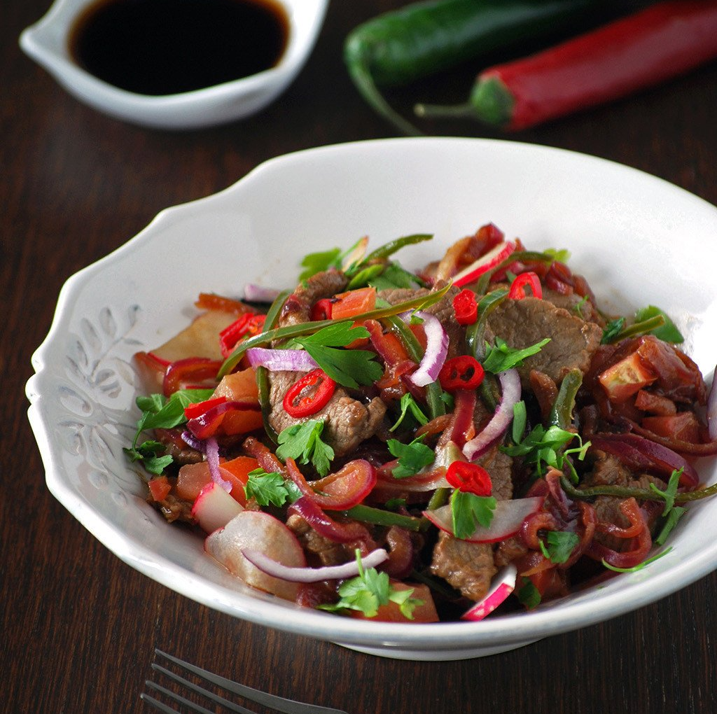 Disponer la carne con la cebolla y el pimiento verde en una fuente. Añadir el pimiento rojo, el tomate y los rabanitos. Agregar perejil, cilantro y albahaca frescos al gusto. Aliñar con la salsa y mezclar bien.